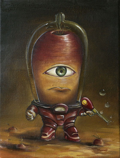 Influenced by American Pop-surrealism, the artist presents us with cuddly and innocent archetypes, often framed within the format of a portrait. These creatures appear friendly, easy company, but seem almost to be victims of their own plight. The depiction of characters as vegetables transforms the well known phrase ‘couch-potato’ into an overwhelming reality where it becomes difficult to distinguish truth from fiction; this is the substance of children’s television programmes.
