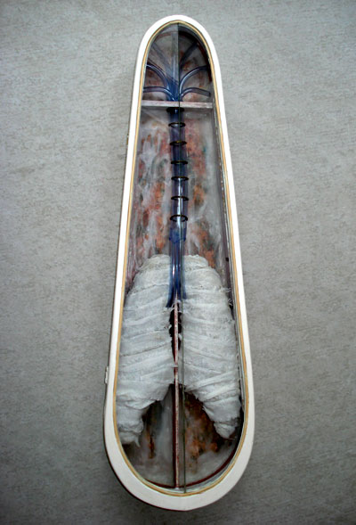 Each work is encapsulated in an object that serves as a vessel to be inhabited and vacated. Questions about how to distinguish between the flesh and the psyche are raised as the relationships between objects and materials vary and suggested reconciliations are played out.