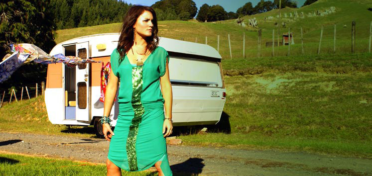 The latest offering is Summer 09: Caravan of LOVE. Brooke had the new gypsy-inspired collection photographed at the Straka homestead in the Bohemian settlement of Puhoi. Borrowing her Mum’s vintage caravan, models Mia and Lee-Anne slunk around in a fantasy trailer as the jewelled palette of floaty silks slipped around them. Mia drew from her historical roots, translating the pioneering free spirit into necklaces of white porcelain birds swinging at the waist. Piercing blue lapis lazuli beads accent the bright white with hints of gold bringing the jewellery to life against emerald green and peacock blue raw silks.