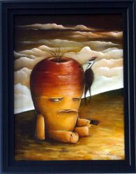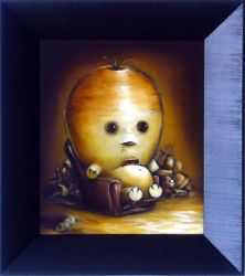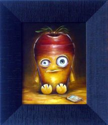 Influenced by American Pop-surrealism, the artist presents us with cuddly and innocent archetypes, often framed within the format of a portrait. These creatures appear friendly, easy company, but seem almost to be victims of their own plight. The depiction of characters as vegetables transforms the well known phrase ‘couch-potato’ into an overwhelming reality where it becomes difficult to distinguish truth from fiction; this is the substance of children’s television programmes.